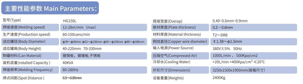 本機型適用于制作φ52-中176mm的食品罐、化工罐等罐身的焊接。歷經數十年生產現場所遇各種材料屬性而不斷優化的設備,適應矮罐,極小罐型及特殊材料的焊接,具有穩定性高,殘次品率低等優點深受國內外市場好評。整機采用全伺服控制,融合現代機械制造自動化程度高,系統操作簡潔,新用戶能夠快速掌握設備性能及調整方法。